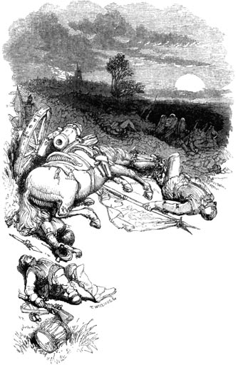 Heaven keep us from a knowledge of the sights the moon beheld upon that field, when, coming up above the black line of distant rising-ground, softened and blurred at the edge by trees, she rose into the sky and looked upon the plain, strewn with upturned faces that had once at mothers’ breasts sought mothers’ eyes, or slumbered happily. Heaven keep us from a knowledge of the secrets whispered afterwards upon the tainted wind that blew across the[5] scene of that day’s work and that night’s death and suffering! Many a lonely moon was bright upon the battle-ground, and many a star kept mournful watch upon it, and many a wind from every quarter of the earth blew over it, before the traces of the fight were worn away.[6]