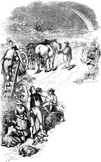 At last the younger of the dancing sisters, out of breath, and laughing gaily, threw herself upon a bench to rest. The other leaned against a tree hard by. The music, a wandering harp and fiddle, left off with a flourish, as if it boasted of its freshness; though, the truth is, it had gone at such a pace, and worked itself to such a pitch of competition with the dancing, that it never could have held on half a minute longer. The apple-pickers on the ladders raised a hum and murmur of applause, and then, in keeping with the sound, bestirred themselves to work again, like bees.