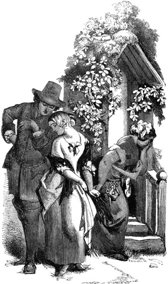 As the active figure of a handsome young man, dressed for a journey, and followed by a porter, bearing several packages and baskets, entered the orchard at a brisk pace, and with an air of gaiety and hope that accorded well with the morning,—these three drew together, like the brothers of the sister Fates, or like the Graces most effectually disguised, or like the three weird prophets on the heath, and greeted him.
