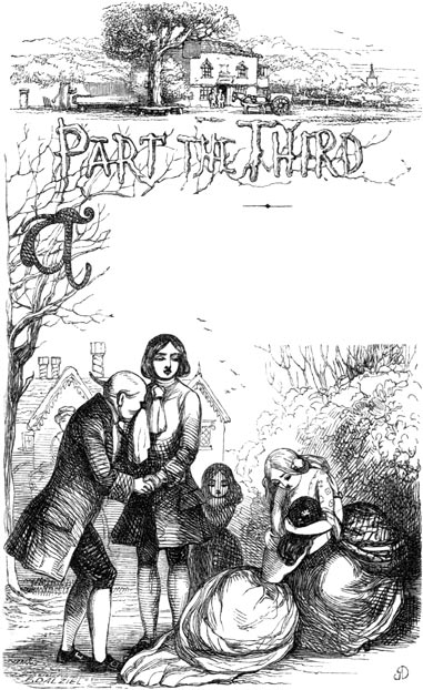 A stranger had come into the orchard, after Mr. Snitchey, and had remained apart, near the gate, without being observed by any of the group; for they had little spare attention to bestow, and that had been monopolised by the ecstasies of Clemency. He did not appear to wish to be observed, but stood alone, with downcast eyes; and there was an air of dejection about him (though he was a gentleman of[172] a gallant appearance) which the general happiness rendered more remarkable.