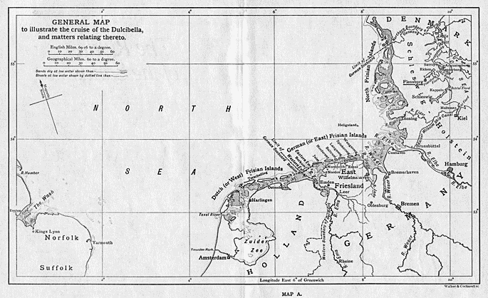 That evening, after threading the maze of shoals between the Dutch mainland and islands, we anchored off the little hamlet of Ostmahorn, [See Map A] gave the yacht in charge of some astonished fishermen, and thence by road and rail, hurrying still, gained Harlingen, and took passage on a steamer to London. From that point our personal history is of no concern to the outside world, and here, therefore, I bring this narrative to an end.
