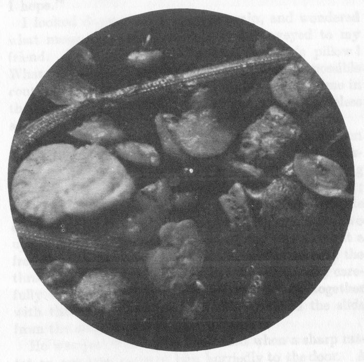 "The next clue is furnished by the sand on the pillow. I took a little of it, and examined it under the microscope, when it turned out to be deep-sea sand from the Eastern Mediterranean. It was full of the minute shells called 'Foraminifera,' and as one of these happened to belong to a species which is found only in the Levant, I was able to fix the locality."