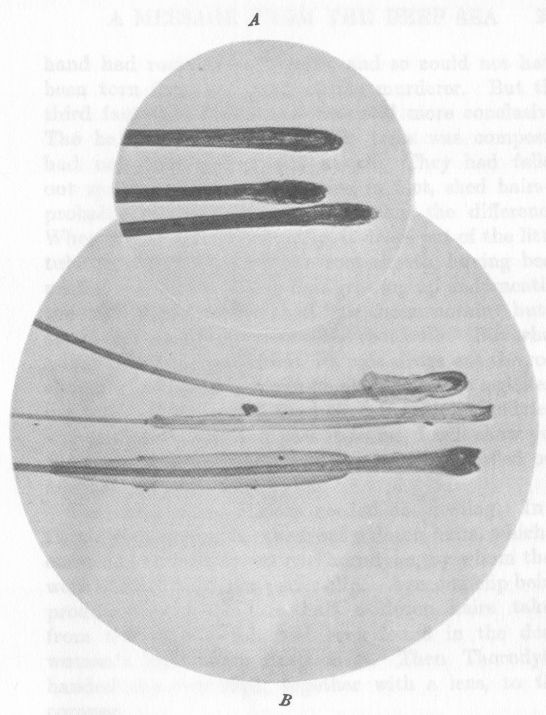 "In the first place there was the condition of the hand. When a person, at the moment of death, grasps any object firmly, there is set up a condition known as cadaveric spasm. The muscular contraction passes immediately into rigor mortis, or death-stiffening, and the object remains grasped by the dead hand until the rigidity passes off. In this case the hand was perfectly rigid, but it did not grasp the hair at all. The little tress lay in the palm quite loosely and the hand was only partially closed. Obviously the hair had been placed in it after death. The other two facts had reference to the condition of the hair itself. Now, when a lock of hair is torn from the head, it is evident that all the roots will be found at the same end of the lock. But in the present instance this was not the case; the lock of hair which lay in the dead woman's hand had roots at both ends, and so could not have been torn from the head of the murderer. But the third fact that I observed was still more conclusive. The hairs of which that little tress was composed had not been pulled out at all. They had fallen out spontaneously. They were, in fact, shed hairs—probably combings. Let me explain the difference. When a hair is shed naturally, it drops out of the little tube in the skin called the root sheath, having been pushed out by the young hair growing up underneath; the root end of such a shed hair shows nothing but a small bulbous enlargement—the root bulb. But when a hair is forcibly pulled out, its root drags out the root sheath with it, and this can be plainly seen as a glistening mass on the end of the hair. If Miriam Goldstein will pull out a hair and pass it to me, I will show you the great difference between hair which is pulled out and hair which is shed."