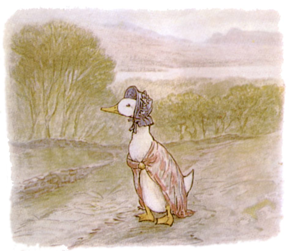 Jemima Puddle-duck became quite desperate. She determined to make a nest right away from the farm.
