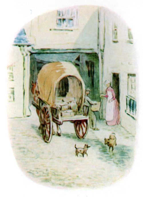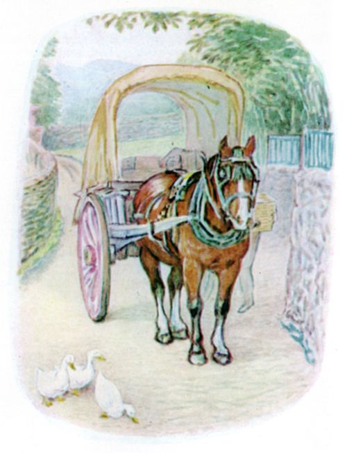 He awoke in a fright, while the hamper was being lifted into the carrier's cart. Then there was a jolting, and a clattering of horse's feet; other packages were thrown in; for miles and miles—jolt—jolt—jolt! and Timmy Willie trembled amongst the jumbled up vegetables. |