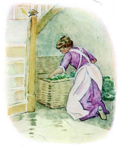 Timmy Willie, who had lived all his life in a garden, was almost frightened to death. Presently the cook opened the hamper and began to unpack the vegetables. Out sprang the terrified Timmy Willie. |