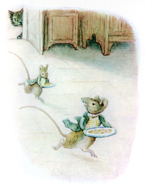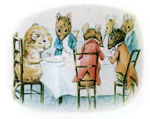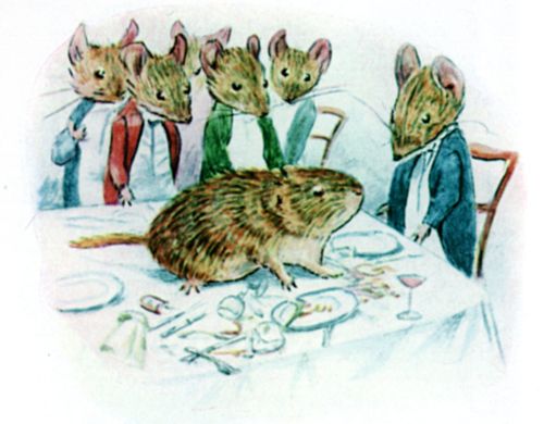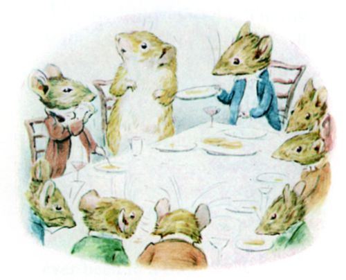 "Why don't those youngsters come back with the dessert?" It should be explained that two young mice, who were waiting on the others, went skirmishing upstairs to the kitchen between courses. Several times they had come tumbling in, squeaking and laughing; Timmy Willie learnt with horror that they were being chased by the cat. His appetite failed, he felt faint. "Try some jelly?" said Johnny Town-mouse. |