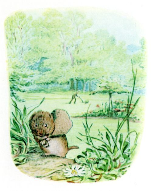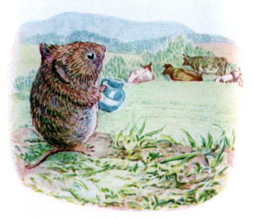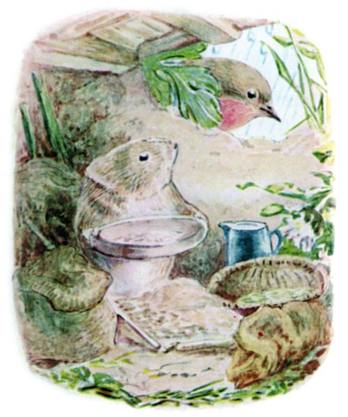 "When it rains, I sit in my little sandy burrow and shell corn and seeds from my Autumn store. I peep out at the throstles and blackbirds on the lawn, and my friend Cock Robin. And when the sun comes out again, you should see my garden and the flowers—roses and pinks and pansies—no noise except the birds and bees, and the lambs in the meadows." |