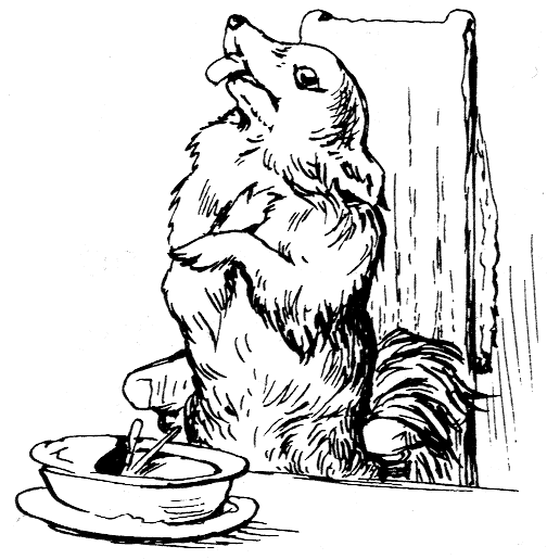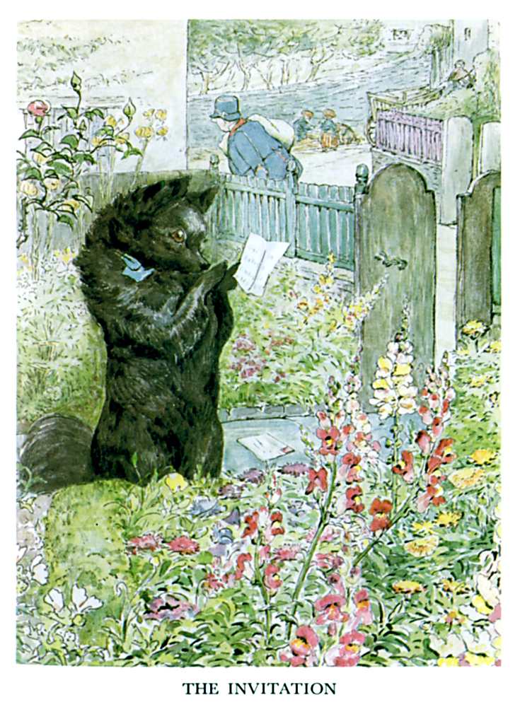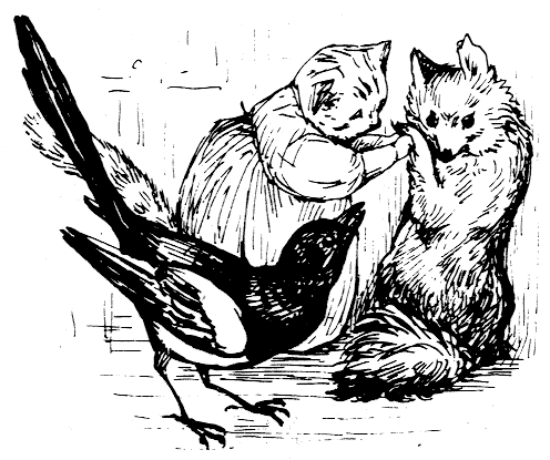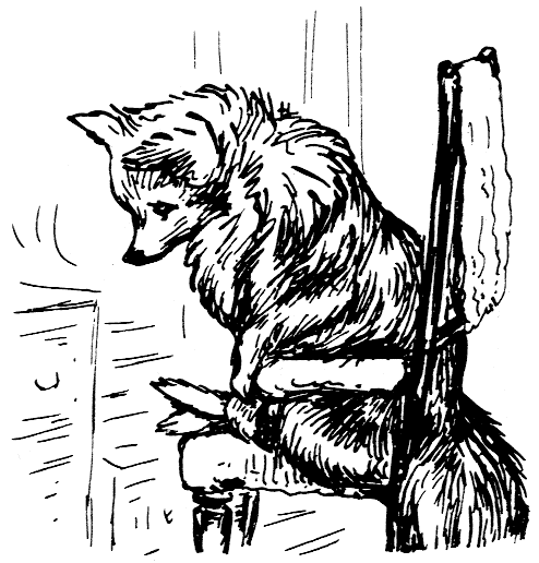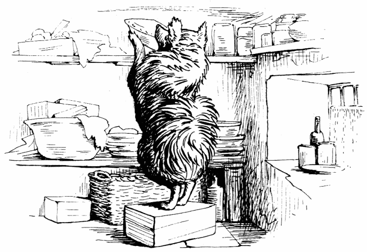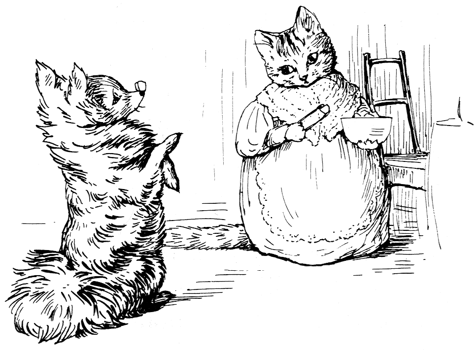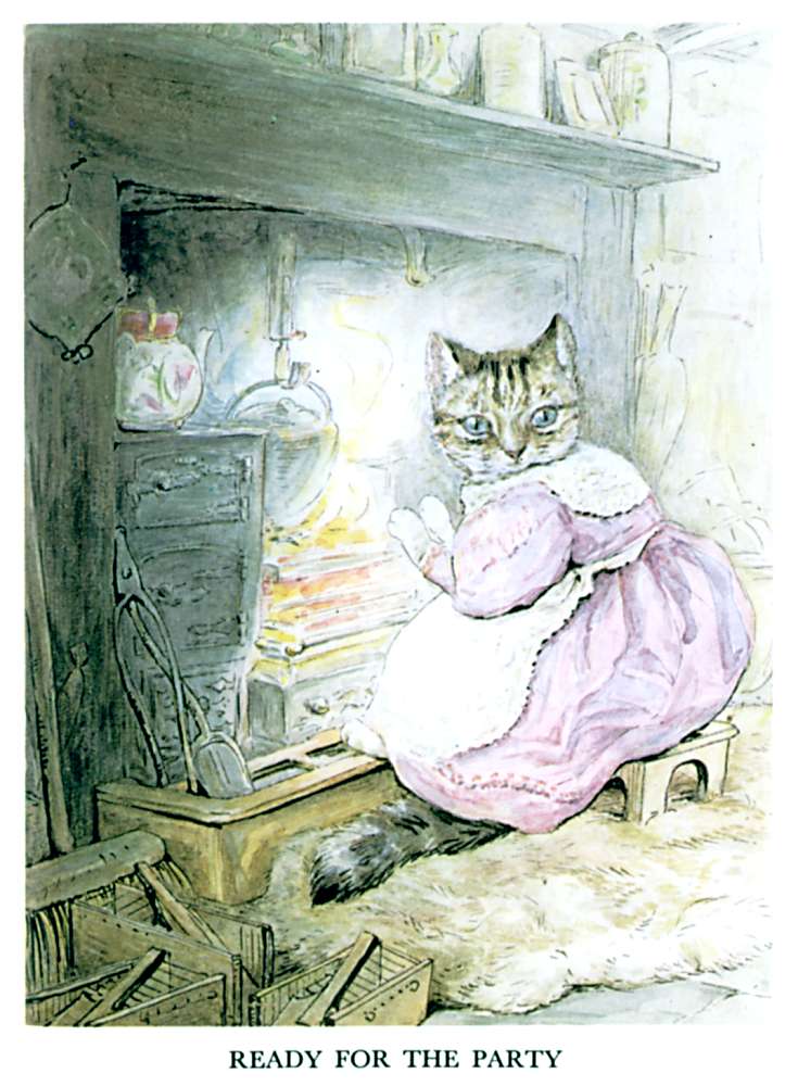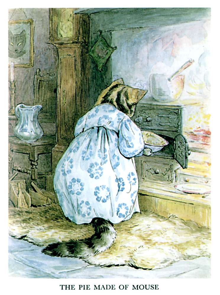 "The top oven bakes too quickly," said Ribby to herself. "It is a pie of the most delicate and tender mouse minced up with bacon. And I have taken out all the bones; because Duchess did nearly choke herself with a fish-bone last time I gave a party. She eats a little fast—rather big mouthfuls. But a most genteel and elegant little dog; infinitely superior company to Cousin Tabitha Twitchit."