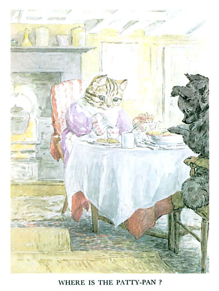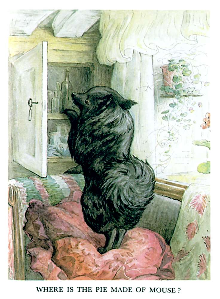"A little dog indeed! Just as if there were no CATS in Sawrey! And a pie for afternoon tea! The very idea!" said Cousin Tabitha Twitchit.