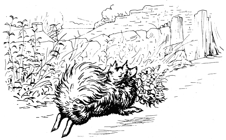 Ribby and Duchess said goodbye affectionately, and Duchess started home. Half-way up the lane she stopped and looked back; Ribby had gone in and shut her door. Duchess slipped through the fence, and ran round to the back of Ribby's house, and peeped into the yard.