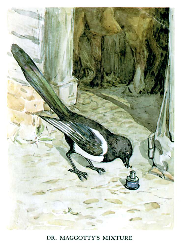 Upon the roof of the pig-stye sat Dr. Maggotty and three jackdaws. The jackdaws were eating pie-crust, and the magpie was drinking gravy out of a patty-pan.