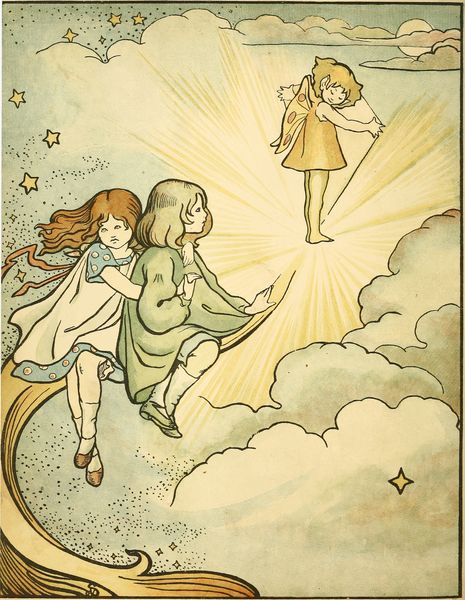 Down swooped the great shining comet, and there it lay across the road, waiting for them to mount. The children climbed on to its broad glittering tail and held tightly to each other, while the wymp mounted in front of them and stood like the man at the wheel, with his hand on the comet's head; then up they flew at a terrific pace, right through the wonderful blue darkness that stretched all round them. Far above was the great land of light that lay round the moon; but the country of the stars came in between, and the stars were still so far off that they had not even begun to look like real stars.