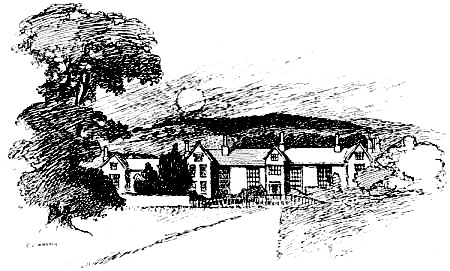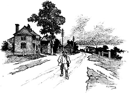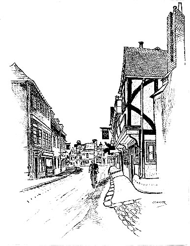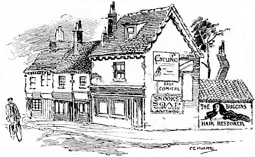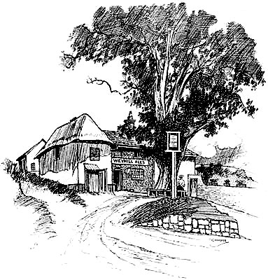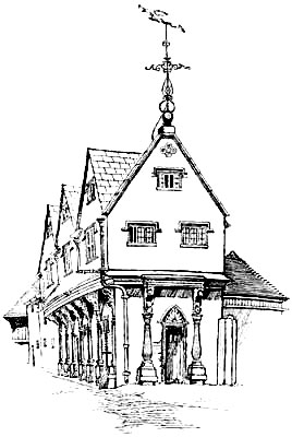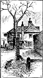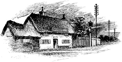 The traveller’s horse stopped before “a road-side inn on the right-hand side of the way, about half a quarter of a mile from the end of the Downs.... It was a strange old place, built of a kind of shingle, inlaid, as it were, with cross-beams, with gabled-topped windows projecting completely over the pathway, and a low door with a dark porch and a couple of steep steps leading down into the house, instead of the modern fashion of half a dozen shallow ones leading up to it.”
