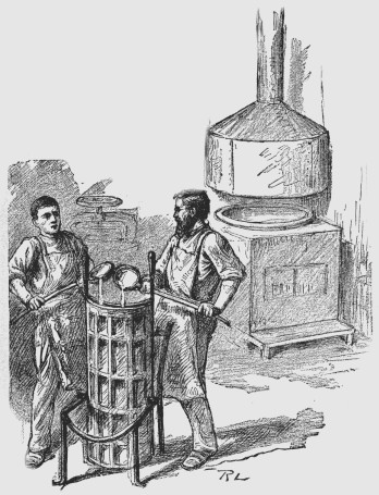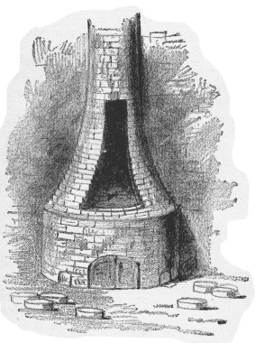 We walked all around and saw here one man making cups, another, tureens, another, bird-baths, and every imaginable thing that is ever made in porcelain. Then we went down-stairs, through the dark rooms, into where the tall chimneys are. Then I found out they called them kilns. They have at the bottom a prodigious furnace, over that a tremendous oven, where they put the dishes in to bake.