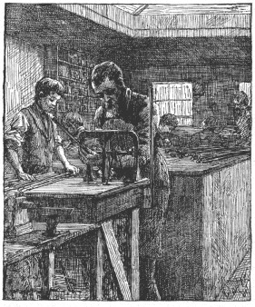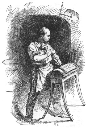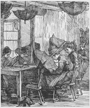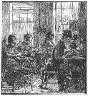 The doll’s shoes!—so pretty, so daintily shaped, so beautifully stitched and trimmed, so perfectly, faultlessly finished from heel to toe, the “cunningest things” in all dolly’s wardrobe—did it ever occur to the girlie “playing mother,” to ask where they came from, and by whose dexterous fingers they were fashioned? She knows well enough that when Angelina Christina, or Luella Rosa Matilda Jennette, has worn 203 these out, there are enough to be bought in the toy shops for twenty-five or thirty cents a pair; but who makes them?