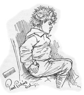 An awl-point arrow is made by inserting the point in the end of the arrow, wrapping with copper wire, and getting a tinner to drop some solder at the end to fasten the wire and awl-point firmly together. The awl-point looks like this: (Fig. K.)