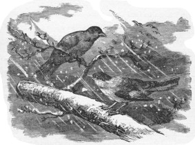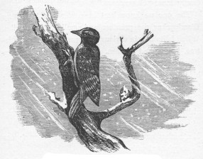 Most of the men who live in the vicinity of the lake region work in the woods in the winter. They camp in tents and log huts near the tracts where they are felling trees. All day long, day after day, week after week, they chop down such trees as are large enough to cut, lop off the branches and haul the logs to the nearest water. This work is done in winter because the logs are more easily managed over snow and ice. All brooks large enough to carry them, all rivers, ponds and lakes, are pressed into service and made to convey the ponderous freight towards civilization. All along 213 the shores and in the woods are busy scenes—men, oxen and horses hard at work, the smoke from the logging camps curling among the trees.