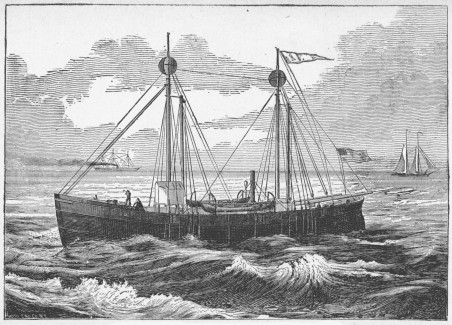 To change its position or shape, ten of the drivers spring into a boat or bateau; one takes a paddle at the bow; eight take oars; and one, at the stern, holds the anchor. They row with quick strokes toward the spot where the anchor is to be dropped, the cable all the time unwinding from the windlass.