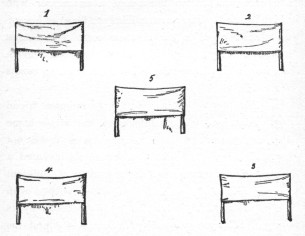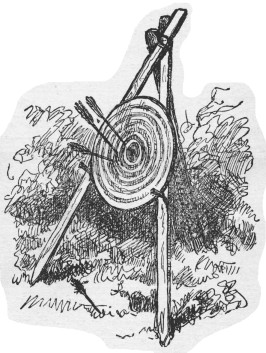 If an arrow struck on a line between number three and four it counts three and a half. Anything like this rarely happens. The target is fixed upon an easel formed of three pieces of wood fastened together by a string at the top, and it ought to lean back at the top slightly, away from the archer.