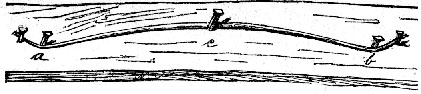 To shape your bow lay it on a stout, flat piece of timber, and drive five ten-penny nails in the timber, one at the centre of your bow, and the others as in figure below, so as to bend the ends for about six inches in a direction contrary to the direction in which you draw the bow: (Fig. D.)