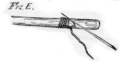 To make a copper wrap, wrap with copper wire the last half-inch of the arrow until you get near the end, then lay a needle as large as your wire obliquely along the arrow as in this figure: (Fig. E.) Continue the wrapping until you have weighted the arrow sufficiently; draw out the needle and thrust the end