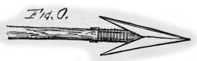 The broad-head hunting-point (Fig. N.) is put on by slitting the arrow and inserting the flat handle of the arrow point, and wrapping it with silk, sinews, or copper wire. These points can be sharpened along the line A B on a whetstone, and will cut like knives. The hunting arrow looks like this: (Fig. O.)