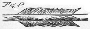 To feather an arrow you strip a goose feather from the quill and, after clipping off the part near the quill-end, you mark a line down the arrow from a 199 point one inch from the nock and, spreading some Spaulding’s glue along that line apply the feather, lightly pressing it home with forefinger and thumb. After you have glued on one piece lay aside the arrow and fix another, and so on until the first is set, so that you may put on another piece. When you have fastened these feathers on each arrow lay them aside for ten or twelve hours. The three feathers will look like this: (Fig. P.)