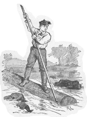 The river-drivers are the men who travel with the logs from the beginning of their journey till they are surrendered to the saw-mills. Each wears shoes the soles of which are thickly studded with iron brads an inch long; and each carries a long pole called a “pick-pole,” which has a strong sharp-pointed iron spike in the end. This they drive into the wood, and it supports and steadies them as they spring from log to log.