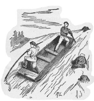 After all the logs are safely sluiced, the chains of the guards are slipped, the rafts are broken up, and 217 these, windlasses and all, follow the logs. Then the boats are put through the sluice. Sometimes, when the dam is high, some of the river-drivers go through in the boats—a dangerous practice, this; for often the bateaux have gone under water, entirely out of 218 sight, to come up below the falls, and more than once have lives been lost in this foolhardy feat.