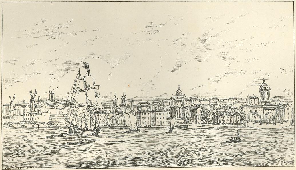 My father was owner and commander of the Mary Ellen. She was launched on the 4th of June, my birthday, and also the anniversary of our revered sovereign, George III. We used to keep his majesty’s birthday in great style. The bells were set ringing, cannon fired, colours waved in the wind, and all the schools had holiday. We don’t love the gracious Lady who presides over our destinies less than we did her august grandfather, but I am sure we do not keep her birthday as we did his. The Mary Ellen was launched on the 4th of June, 1775. She was named after and by my mother. The launch of this ship is about the first thing I can remember. The day’s proceedings are indelibly fixed upon my memory. We went down to the place where the ship was built, accompanied by our friends. We made quite p. 9a little procession, headed by a drum and fife. My father and mother walked first, leading me by the hand. I had new clothes on, and I firmly believed that the joy bells were ringing solely because our ship was to be launched. The Mary Ellen was launched from a piece of open ground just beyond the present Salt-house Dock, then called, “the South Dock.” I suppose the exact place would be somewhere about the middle of the present King’s Dock. The bank on which the ship was built sloped down to the river. There was a slight boarding round her. There were several other ships and smaller vessels building near her; amongst others, a frigate which afterwards did great damage to the enemy during the French war. The government frequently gave orders for ships to be built at Liverpool. The view up the river was very fine. There were few houses to be seen southward. The mills on the Aigburth-road were the principal objects.