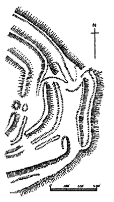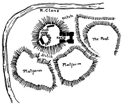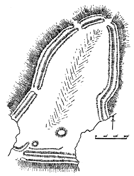 (a) Promontory Forts.—This type of fort is prehistoric as a rule and not characterised by an excess of variation. No distinctive uniformity can be traced, it is true, but special features may be discovered in almost every example of the class. It is only natural that primitive man should seize upon any spot which promised the minimum of labour to adapt it for his purpose of protection, hence distinguishing features may be [Pg 7] discerned in almost every case, depending upon the presence of a precipice, slope, bog, wood, chasm, marsh, etc. The description of a few of these fortresses will sufficiently illustrate the point.