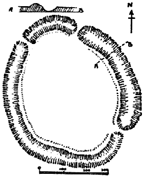 | This gigantic earthwork looms darkly in the distance, with indications upon its broken outline of the enormous mounds and fosses which render it one of the most impressive examples of its class. As a work of Neolithic man it commands attention, both by reason of the vastness of its plan and the skill shown in the design. | ||