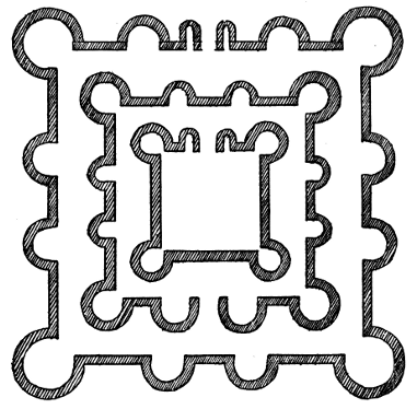 Man is essentially a pugilistic animal and experiences a keen sense of delight in hunting all objects of the chase, ferocious or otherwise, but the keenest undoubtedly when upon the track of the grandest of all game—man. But at the same time though willing to inflict injury he invariably does so at the minimum of risk to himself, deeming the preservation of his own life, the greatest of the gifts that Nature has bestowed upon him, of the first importance. Thus it is conceivable that after the selection of a stone or the fabrication of a club by primitive man he naturally proceeded to make a protection for himself to counteract the effect of those weapons when wielded by others, and the shield would follow as a logical sequence. The shield was to all intents and purposes a movable castle, since [Pg 2] it afforded him the means of causing the greatest amount of annoyance to his enemy, while at the same time furnishing the maximum means of protection to himself; a definition which is appropriate to the first and latest type of feudal castle. As a non-movable protection he would soon recognise the advantages afforded by a tree, a rock, a fold in the ground; and the efficacy of these natural defences would suggest artificial examples where they were non-existent.