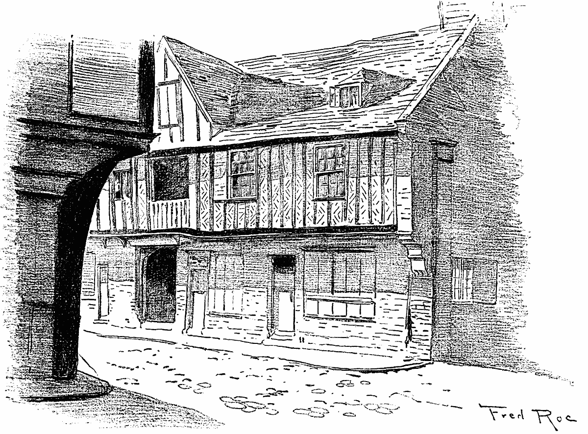 Another leading East Anglian port in former days was the county town of Suffolk, Ipswich. During the thirteenth and fourteenth centuries ships from most of the countries of Western Europe disembarked their cargoes on its quays—wines from Spain, timber from Norway, cloth from Flanders, salt from France, and "mercerie" from Italy left its crowded wharves to be offered for sale in the narrow, busy streets of the borough. Stores of fish from Iceland, bales of wool, loads of untanned hides, as well as the varied agricultural produce of the district, were exposed twice in the week on the market stalls.6 The learned editor of the Memorials of Old Suffolk, who knows the old town so well, tells us that the stalls of the numerous markets lay within a narrow limit of space near the principal churches of the town—St. Mary-le-Tower, St. Mildred, and St. Lawrence. The Tavern Street of to-day was the site of the flesh market or cowerye. A narrow street leading thence to the Tower Church was the Poultry, and Cooks' Row, Butter Market, Cheese and Fish markets were in the vicinity. The manufacture of leather was the leading industry of old Ipswich, and there was a goodly company of skinners, barkers, and tanners employed in the trade. Tavern Street had, as its name implies, many taverns, and was called the Vintry, from the large number of opulent vintners who carried on their trade with London and Bordeaux. Many of these men were not merely peaceful merchants, but fought with Edward III in his wars with France and were knighted for their feats of arms. Ipswich once boasted of a castle which was destroyed in Stephen's reign. In Saxon times it was fortified by a ditch and a rampart which were destroyed by the Danes, but the fortifications were renewed in the time of King John, when a wall was built round the town with four gates which took their names from the points of the compass. Portions of these remain to bear witness to the importance of this ancient town. We give views of an old building near the custom-house in College Street and Fore Street, examples of the narrow, tortuous thoroughfares which modern improvements have not swept away.