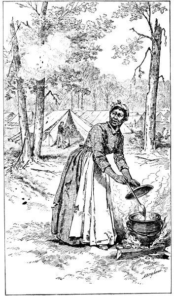 Eliza often cooked under fire, and only lately one of the General's staff, recounting war days, described her as she was preparing the General's dinner in the field. A shell would burst near her; she would turn her head in anger at being disturbed, unconscious that she was observed, begin to growl to herself about being obliged to move, but take up her kettle and frying-pan, march farther away, make a new fire, and begin cooking as unperturbed as if it were an ordinary disturbance instead of a sky filled with bits of falling shell. I do not repeat that polite fiction of having been on the spot, as neither the artist nor I had Eliza's grit or pluck; but we arranged the camp-kettle, and Eliza fell into the exact expression, as she volubly began telling the tale of "how mad those busting shells used to make her." It is an excellent likeness, even though Eliza objects to the bandana, which she has abandoned in her new position; and I must not forget that I found her one day turning her head critically from[29] side to side looking at her picture; and, out of regard to her, will mention that her nose, of which she is very proud, is, she fears, a touch too flat in the sketch. She speaks of her dress as "completely whittled out with bullets," but she would like me to mention that "she don't wear them rags now."