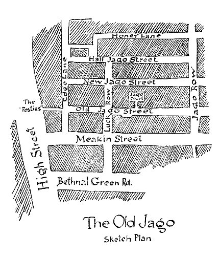 From where, off Shoreditch High Street, a narrow passage, set across with posts, gave menacing entrance on one end of Old Jago Street, to where the other end lost itself in the black beyond Jago Row; from where Jago Row began south at Meakin Street, to where it ended north at Honey Lane—there the Jago, for one hundred years the blackest pit in London, lay and festered; and half-way along Old Jago Street a narrow archway gave upon Jago Court, the blackest hole in all that pit.