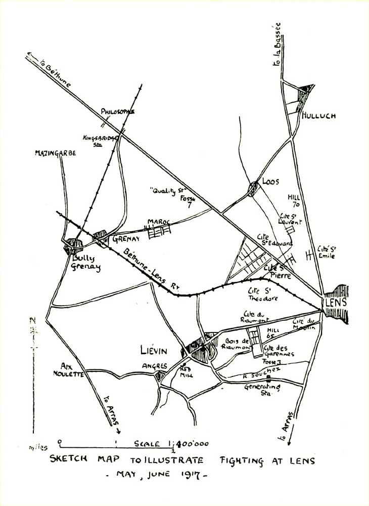The following narrative is based mainly on the Regimental War Diary. For the rest, my thanks are due to Lt.-Colonels C.H. Jones, C.M.G., T.D., and J. Ll. Griffiths, D.S.O., Major C. Bland, T.D., Captains D.B. Petch, M.C., J.R. Brooke, M.C., and A.D. Pierrepont, and R.Q.M.S. R. Gorse, M.S.M., for sending me notes and anecdotes; to Captains G.E. Banwell, M.C., and C.S. Allen, Corpl. J. Lincoln, and L/Corpl. A.B. Law, for taking me round the battlefields and explaining the Lens fighting of 1917; to 2nd Lieut. G.H. Griffiths, for supplying me with many of the battlefield photographs; to all officers, N.C.O.'s and men of the Battalion who have always been ready to answer my questions and to give me information; to Major D. Hill, M.C., Brigade Major, for the loan of his Brigade documents; and lastly to Mr. Deakin of Loughborough, for undertaking the publication of this book and for giving to it so much time and personal care.