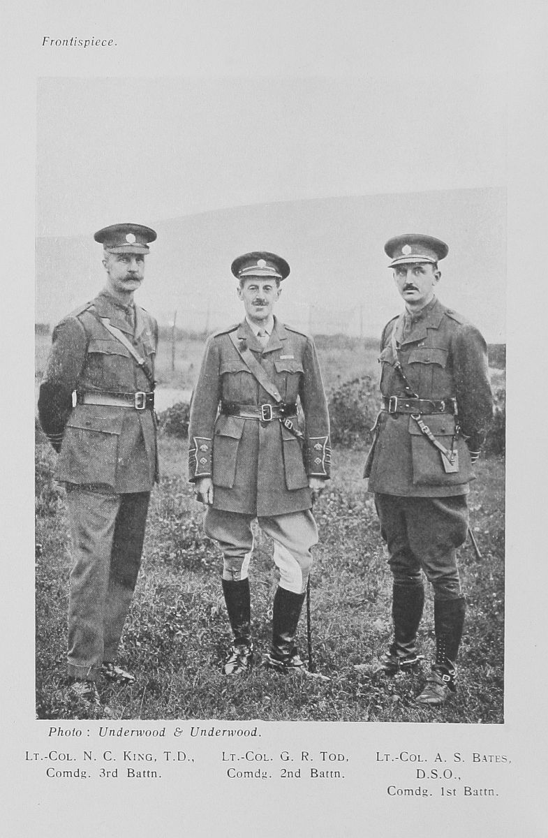 | Lt.-Col. N. C. King, T.D., Comdg. 3rd Battn. | Lt.-Col. G. R. Tod, Comdg. 2nd Battn. | Lt.-Col. A. S. Bates, D.S.O., Comdg. 1st Battn. |