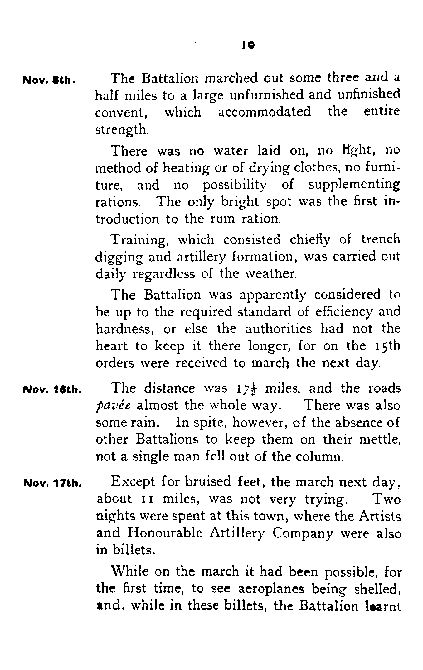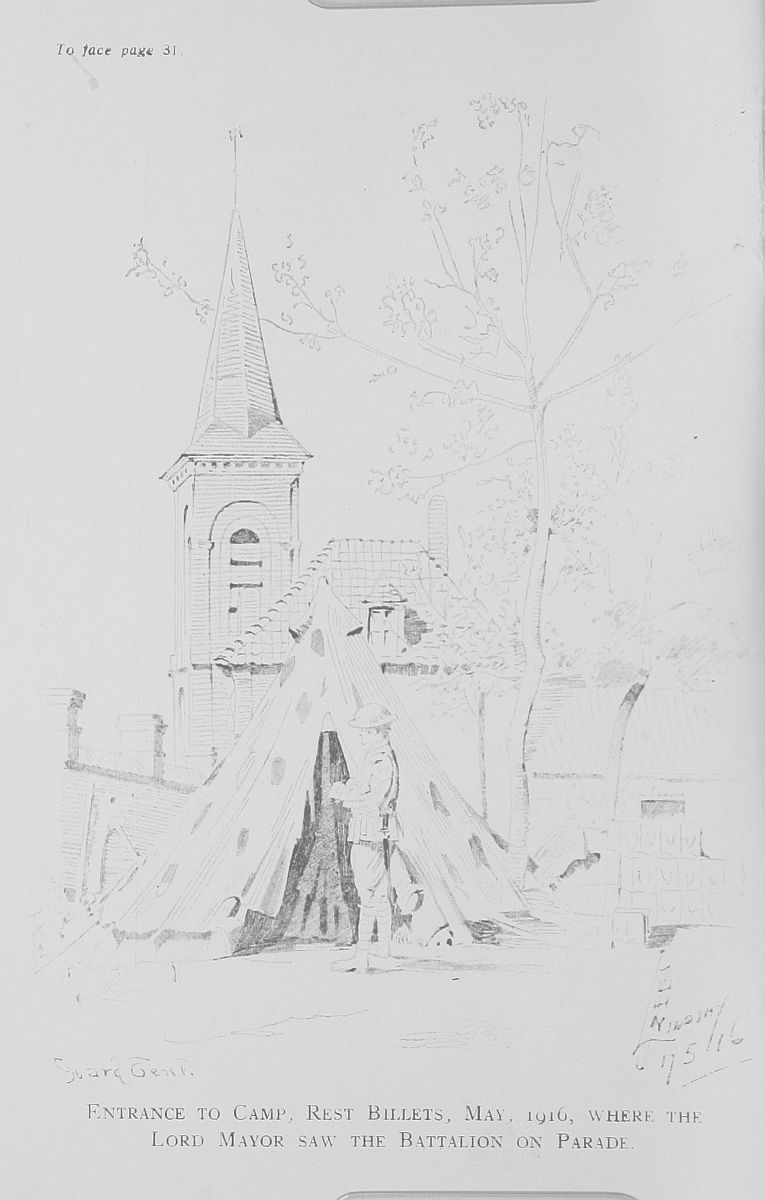 Except for bruised feet, the march next day, about 11 miles, was not very trying. Two nights were spent at this town, where the Artists and Honourable Artillery Company were also in billets.