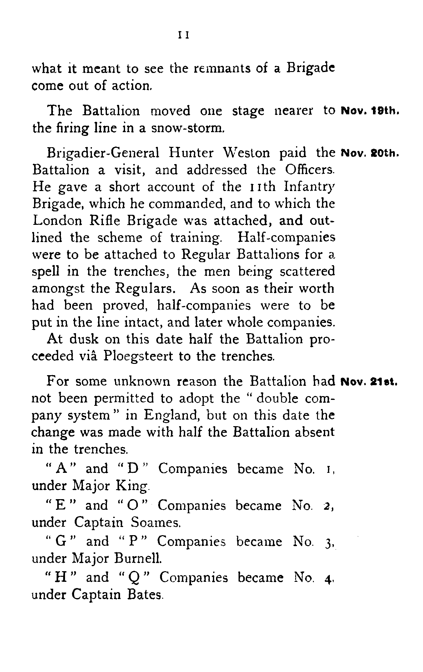 Brigadier-General Hunter Weston paid the Battalion a visit, and addressed the Officers. He gave a short account of the 11th Infantry Brigade, which he commanded, and to which the London Rifle Brigade was attached, and outlined the scheme of training. Half-companies were to be attached to Regular Battalions for a spell in the trenches, the men being scattered amongst the Regulars. As soon as their worth had been proved, half-companies were to be put in the line intact, and later whole companies.