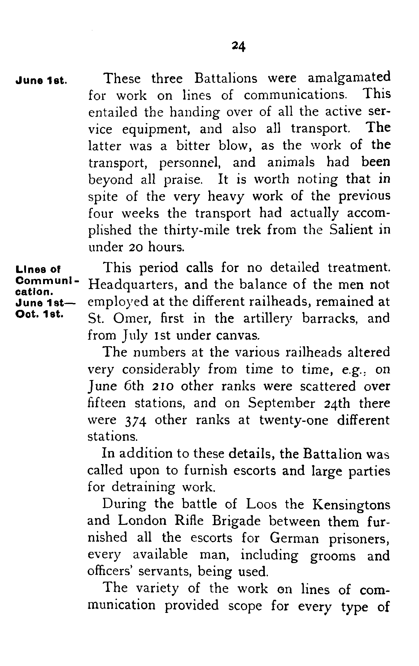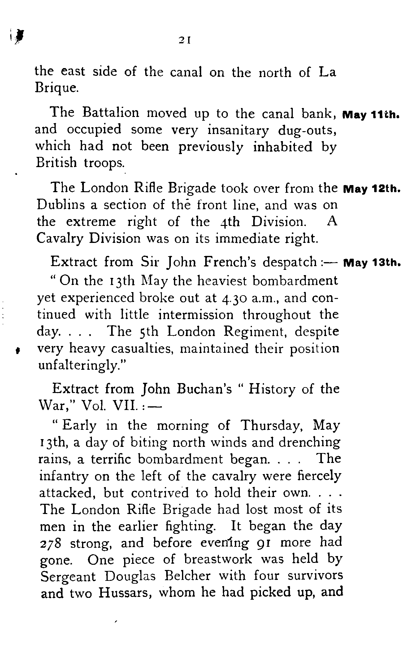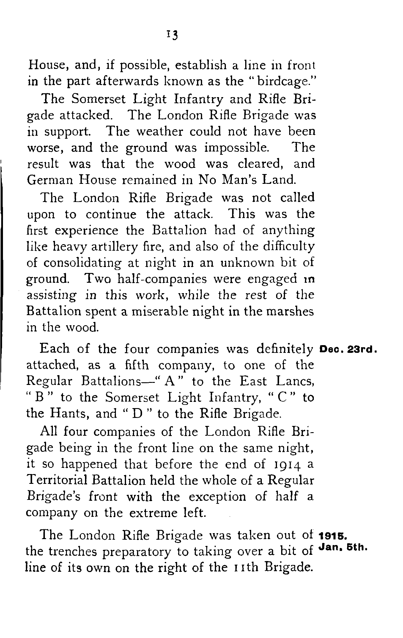 All four companies of the London Rifle Brigade being in the front line on the same night, it so happened that before the end of 1914 a Territorial Battalion held the whole of a Regular Brigade's front with the exception of half a company on the extreme left.