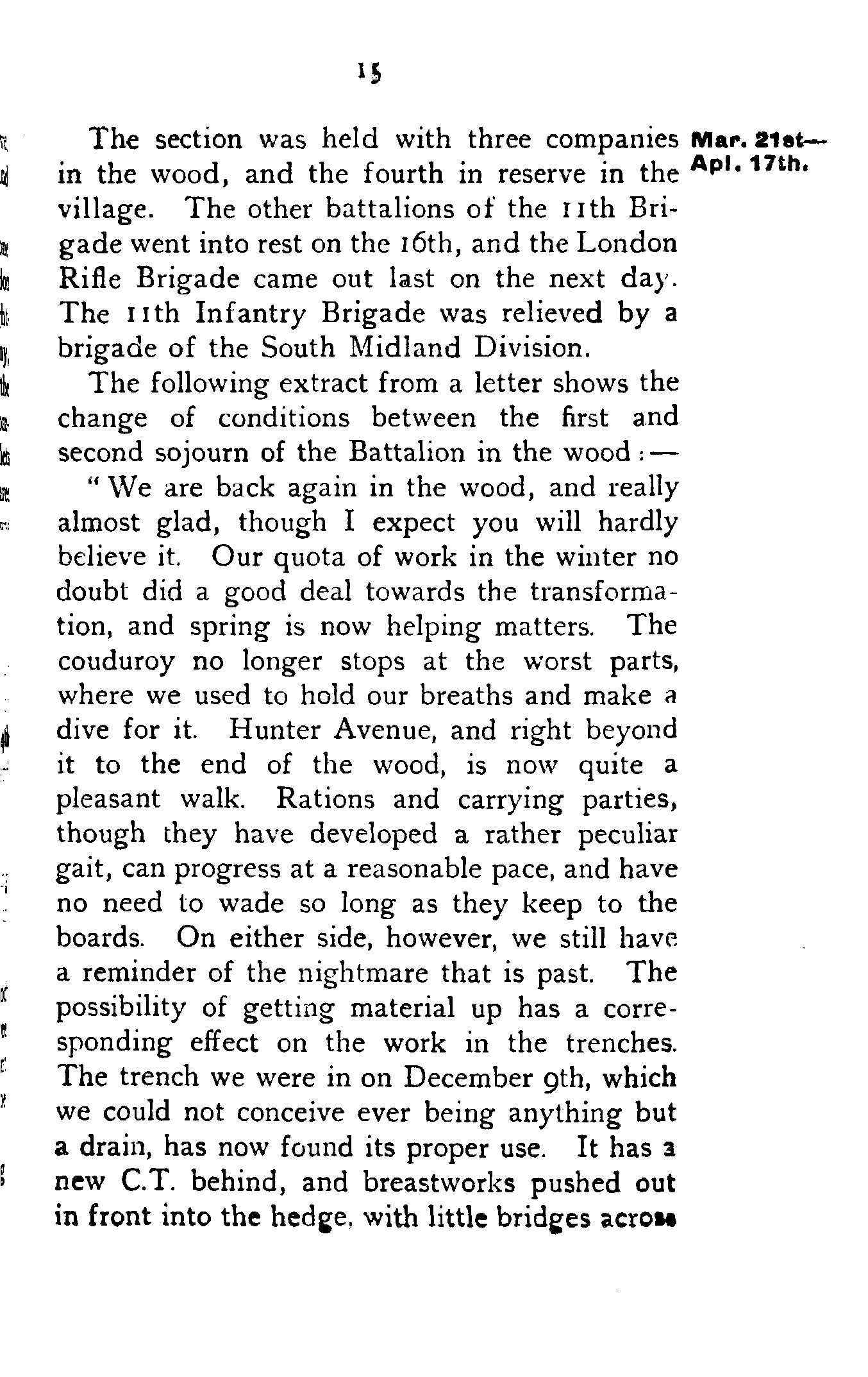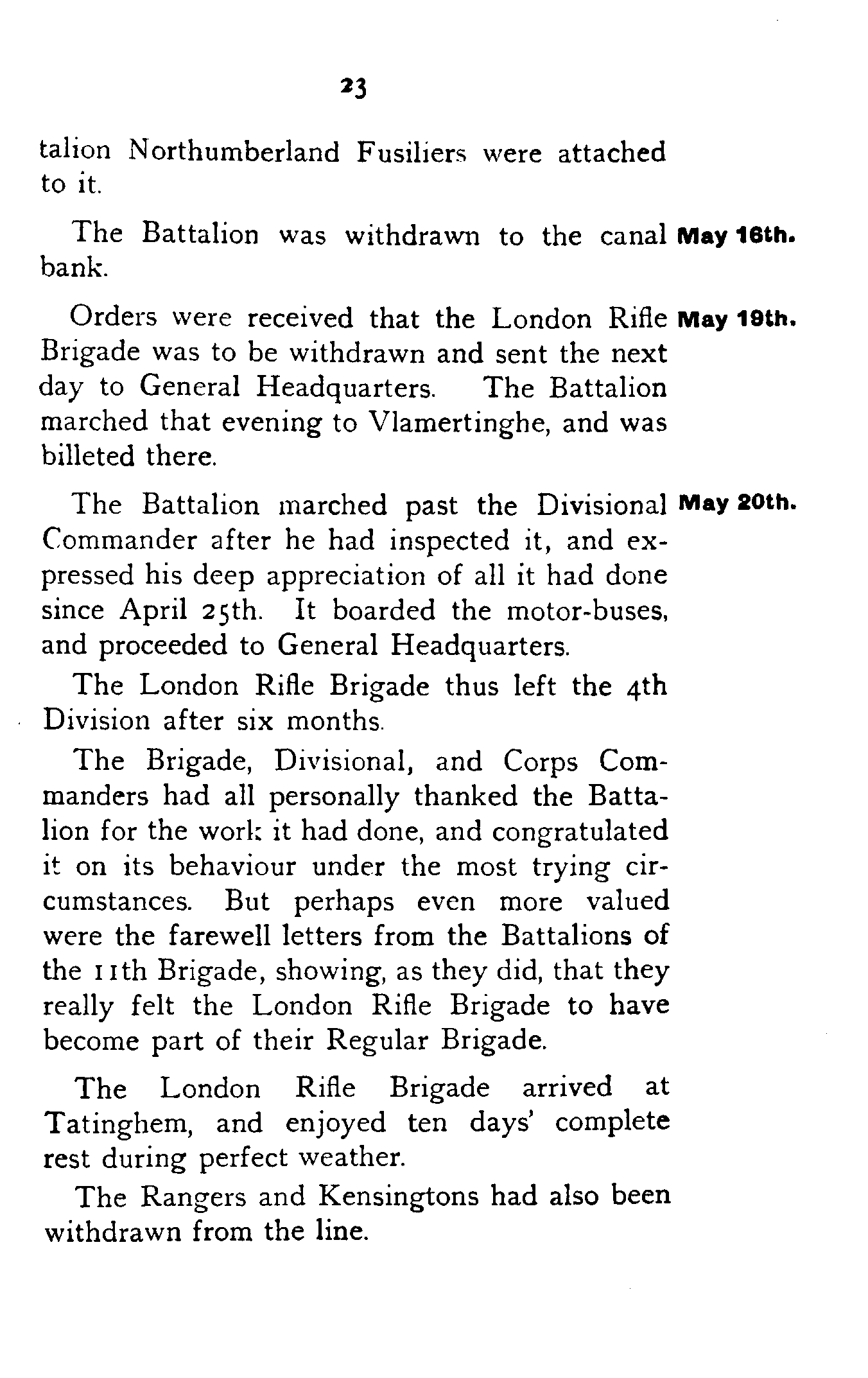The London Rifle Brigade was taken out of the trenches preparatory to taking over a bit of line of its own on the right of the 11th Brigade.[14]