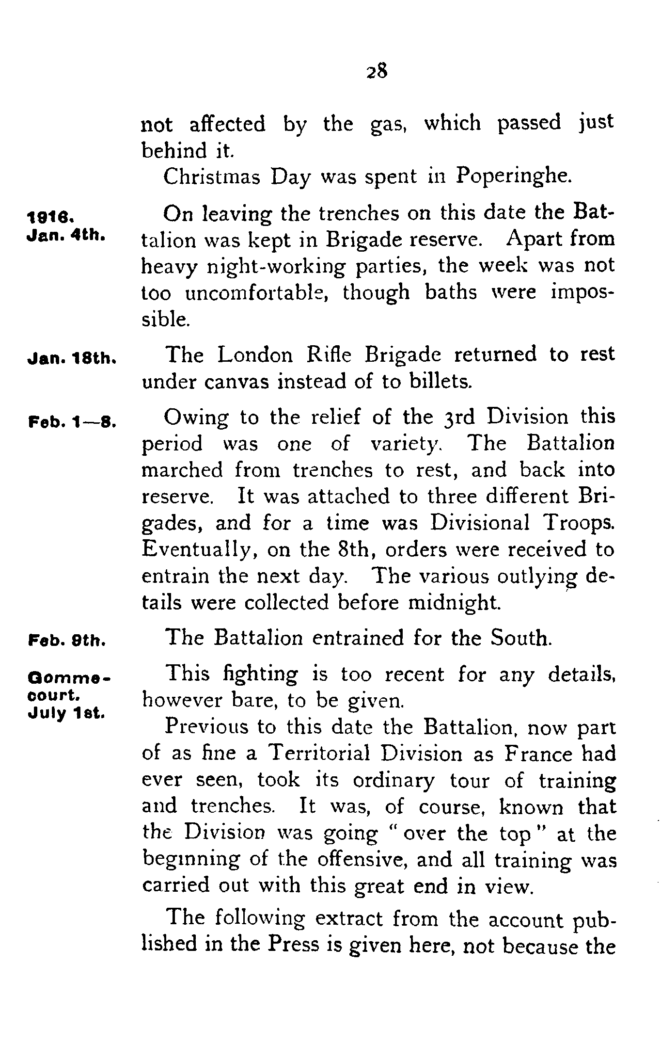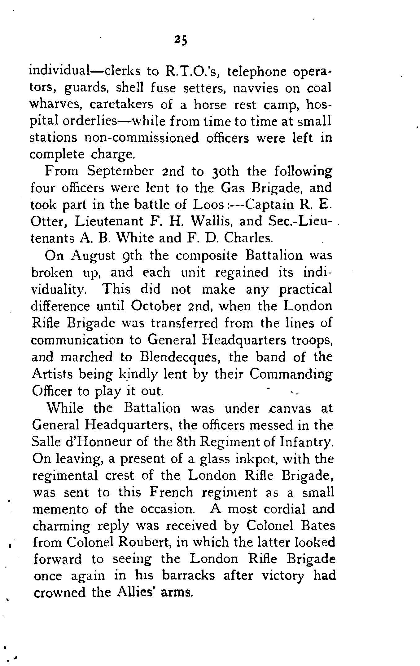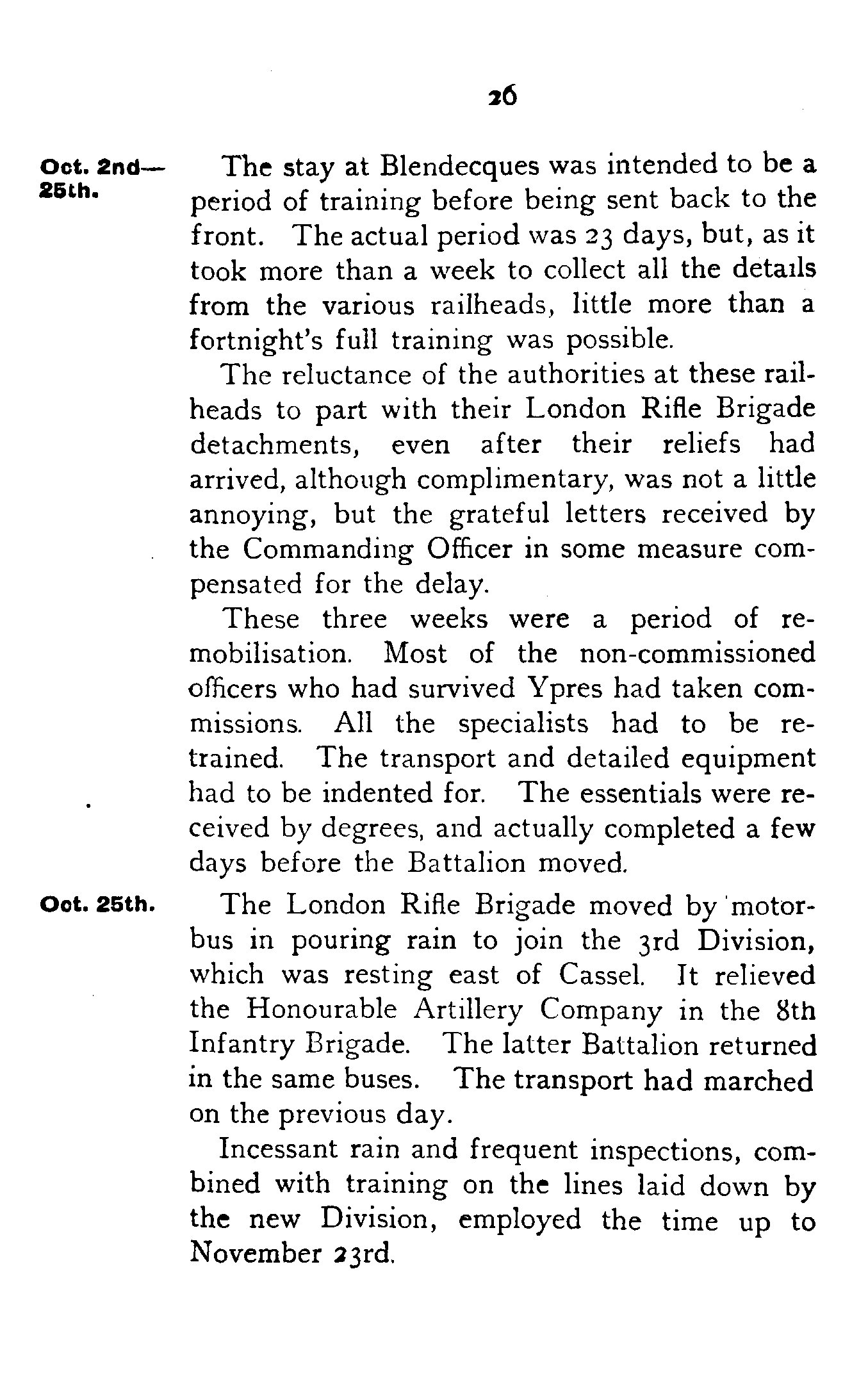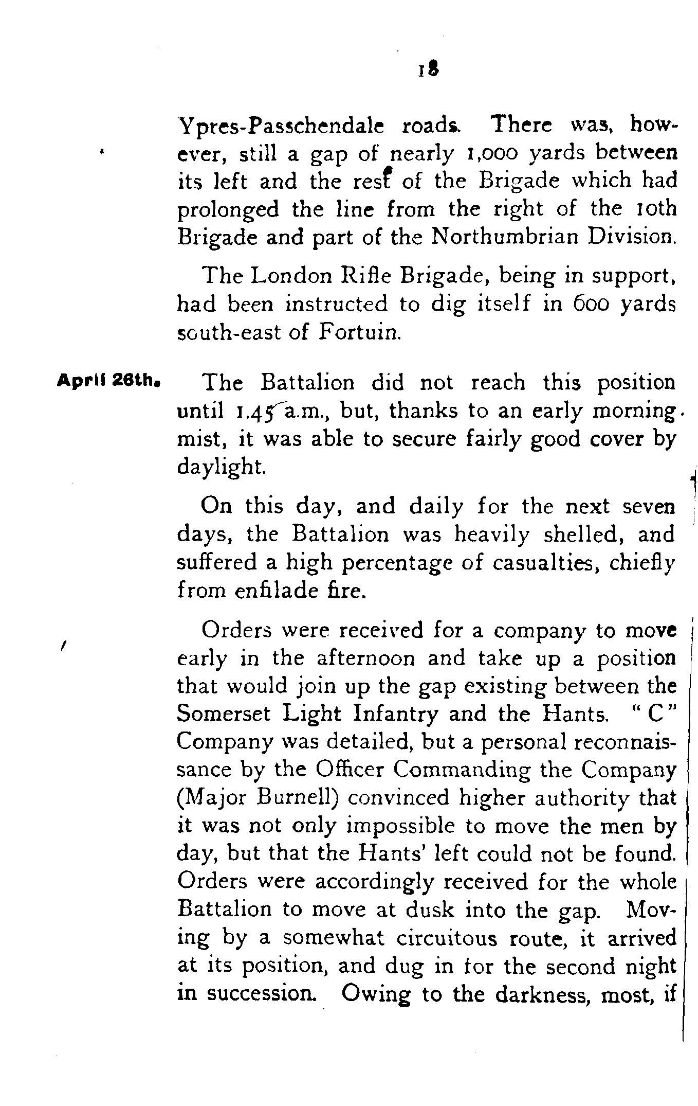 Each of the four companies was definitely attached, as a fifth company, to one of the Regular Battalions—"A" to the East Lancs, "B" to the Somerset Light Infantry, "C" to the Hants, and "D" to the Rifle Brigade.