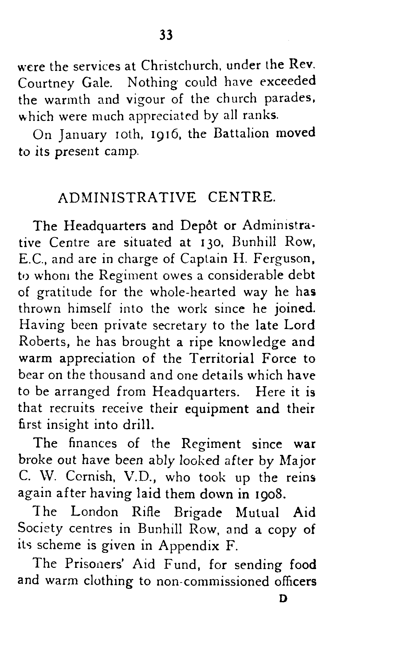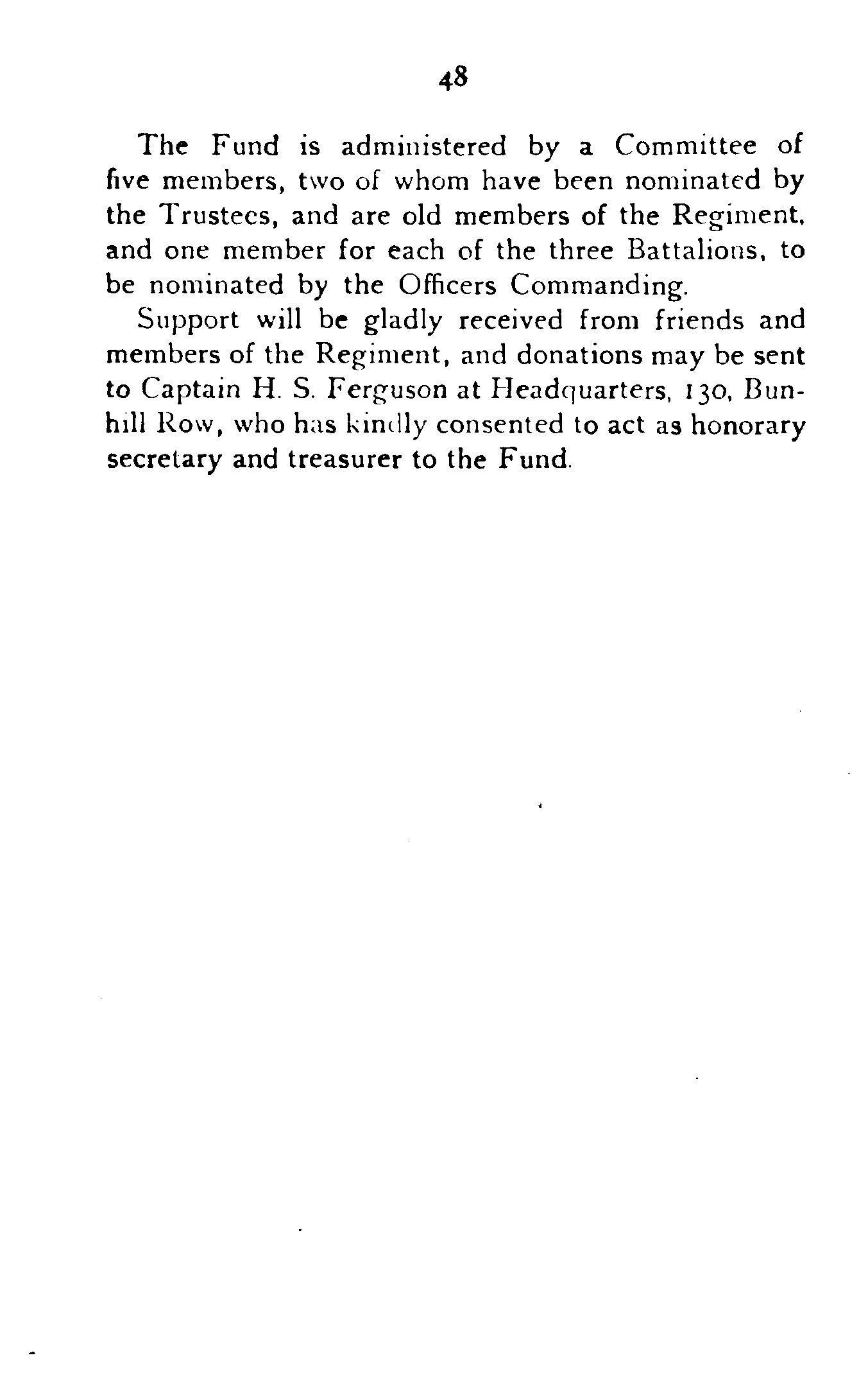 Support will be gladly received from friends and members of the Regiment, and donations may be sent to Captain H. S. Ferguson at Headquarters, 130, Bunhill Row, who has kindly consented to act as honorary secretary and treasurer to the Fund.