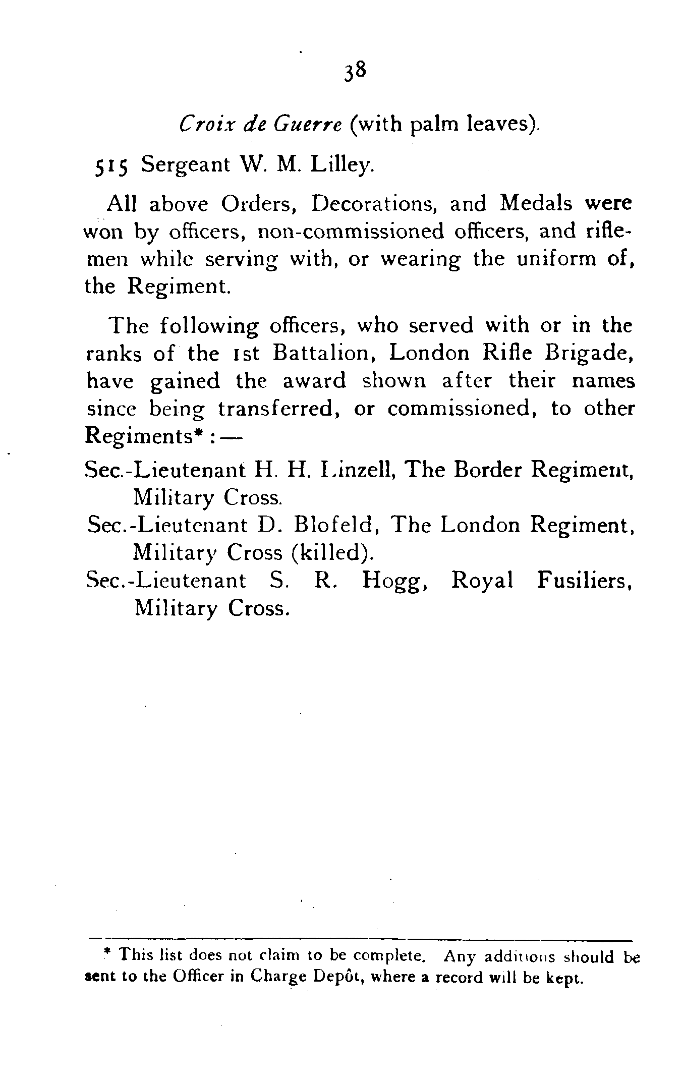 List of attached officers who have served with the 1st Battalion, London Rifle Brigade, in France, excluding those now with it whose names have not been passed by the Censor for publication:—