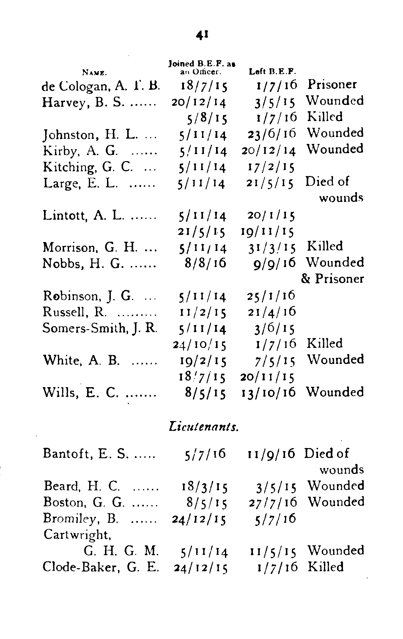 | Crisp, H. J. F. | 27/5/16 | 14/9/16 | Wounded |