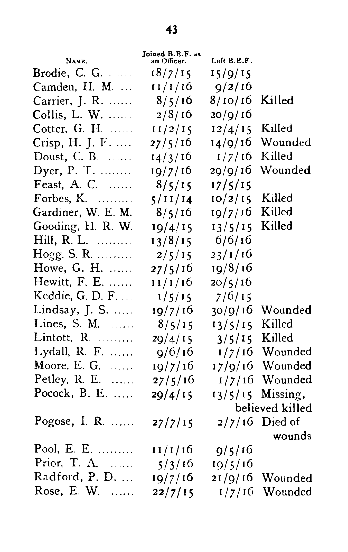 | Radford, P. D. | 19/7/16 | 21/9/16 | Wounded |