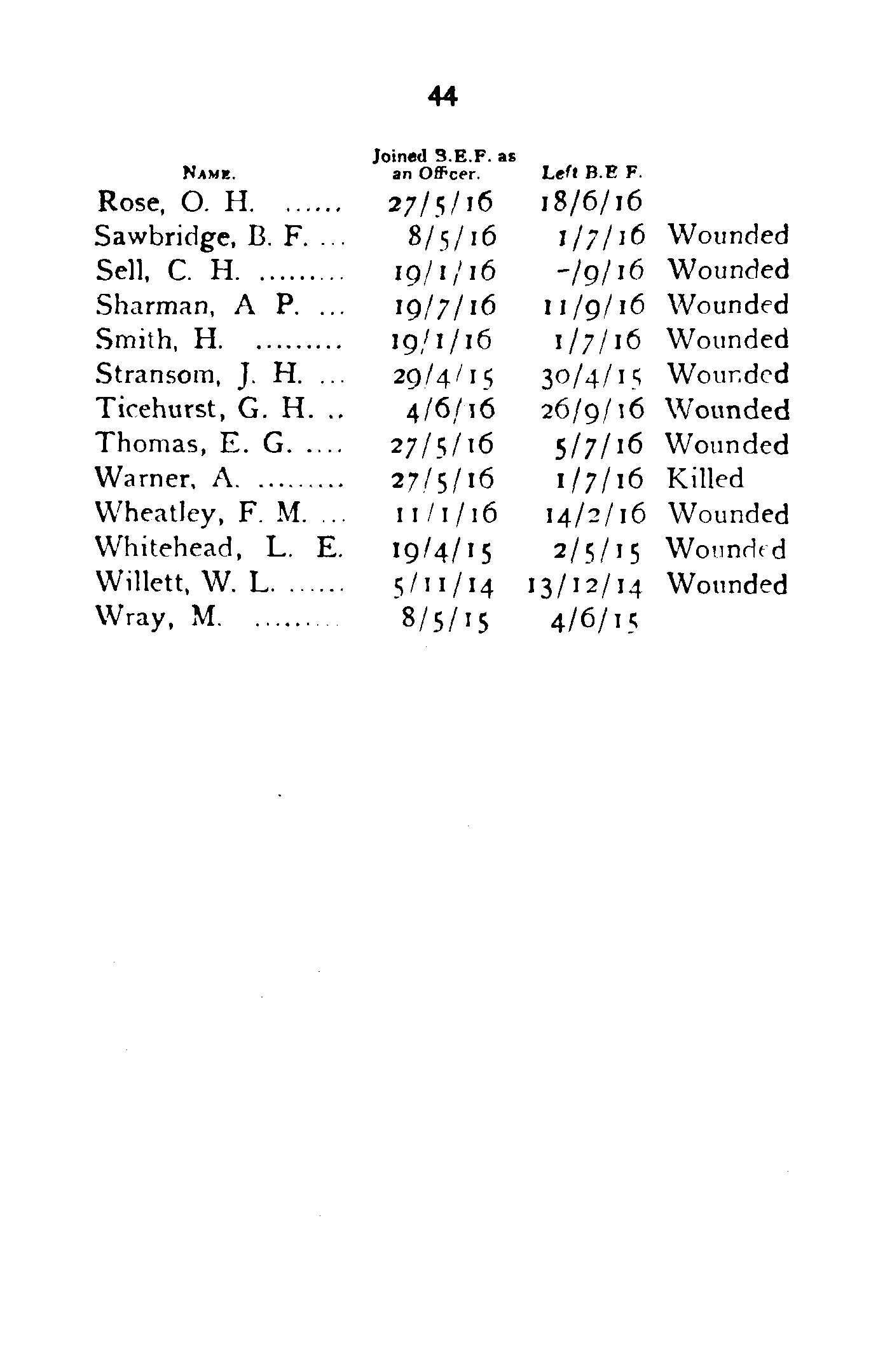 | Thomas, E. G. | 27/5/16 | 5/7/16 | Wounded |