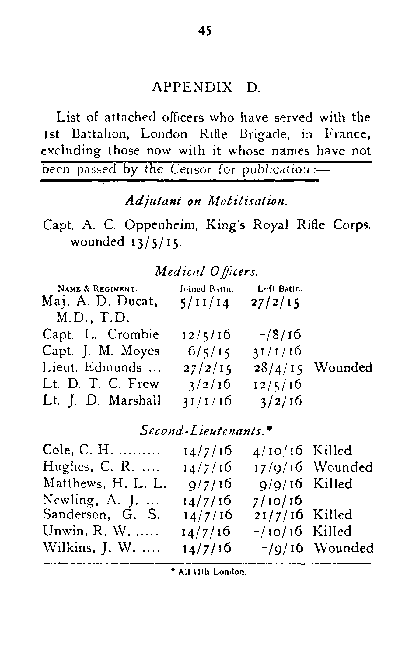 | Maj. A. D. Ducat, M.D., T.D. | 5/11/14 | 27/2/15 | |